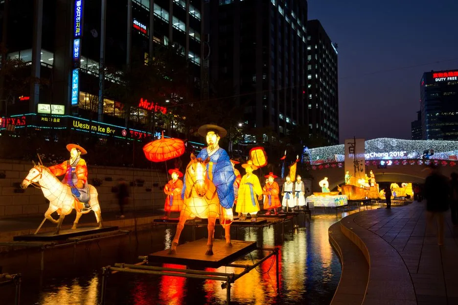 Mengunjungi SUWON STARFIELD LIBRARY & MALL – Perpustakaan ikonik dengan buku dekoraif tata ruang menawan & lampu planet di plafon. Kembali ke Seoul untuk melihat festival lentera & karya seni cahaya di sepanjang sungai CHEONGYECHON. Berbelanja di DONGDAEMUN MARKET. Bermalam di Seoul.